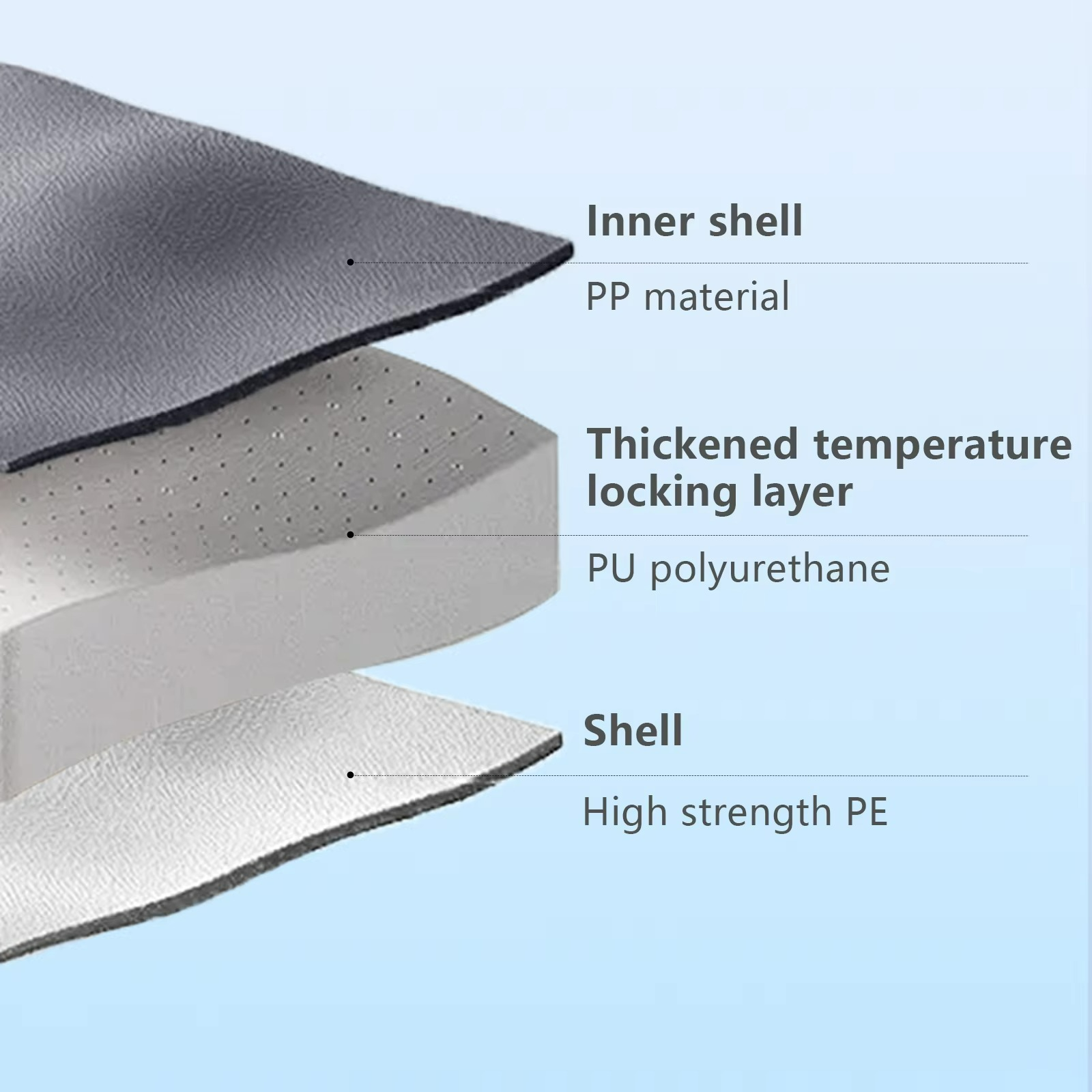- Material : Innere Schale (PP -Material), verdickte Temperaturverriegelungsschicht (PU Polyurethan), Schale (hohe Festigkeit PE)