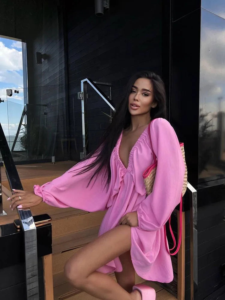 Entdecken Sie den lebhaften Charme des SADIE Sommerkleides mit langen Ärmeln, perfekt für Ihr nächstes Urlaub oder Reise Abenteuer. Dieses boho-inspirierte Kleid verfügt über eine verspielte Zuckerfarben Palette und einen tiefen V-Ausschnitt, der einen Hauch von Eleganz in den lässigen Schnitt bringt. Ideal für warme Sommertage, verbindet es mühelos Stil mit Komfort.